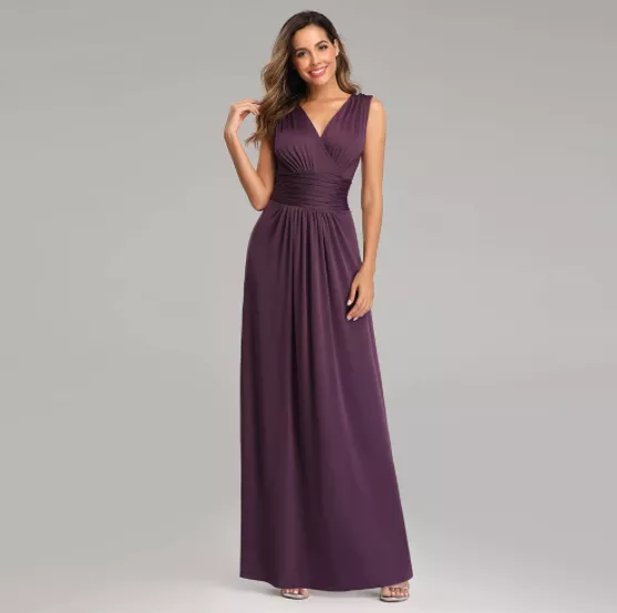שמלת מקסי פשוטה שנשפכת לרצפה, מודרנית, אלגנטית ומעוצבת, מתאימה למסיבת רווקות, חתונה או כל אירוע אחר.